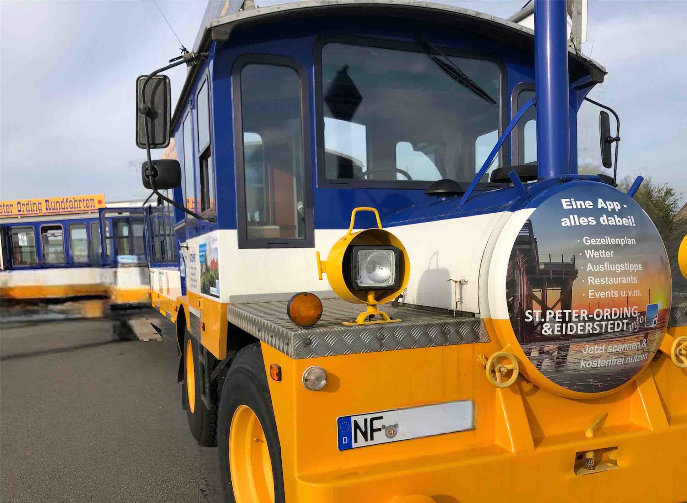 Was ich nicht wußte… es gibt eine Fahrt mit dem Hitzlöper direkt von St.-Peter Bad nach Westerhever. Der Hitzlöper ist ein Touristenzug (hört sich albern an, aber ist wirklich ganz schön) mit zwei Holzanhängern (Link siehe unten), gefahren von einem sehr netten und auskunftsfreudigem Herrn, der während der gesamten Fahrt sein Wissen über die Region, deren Entstehung und Landgewinnung, Tierhaltung, Landwirtschaft, Bauweise der Warften, deren Bewohner und noch ganz viel mehr weiter gibt. Teilweise sind auch Anekdoten dabei, die uns Reisende schmunzeln lassen. Teilweise sind sie wohl auch ausgedacht. Aber das meiste stimmt. Und einige der Touristen halten sogar Wahrheiten für Schabernack. Zum Beispiel die Farbflecken auf den Rücken der Schafe. Aber ich kannte den Grund bereits, daher hat mich amüsiert, wie meine Mitreisenden sich veräppelt fühlten.