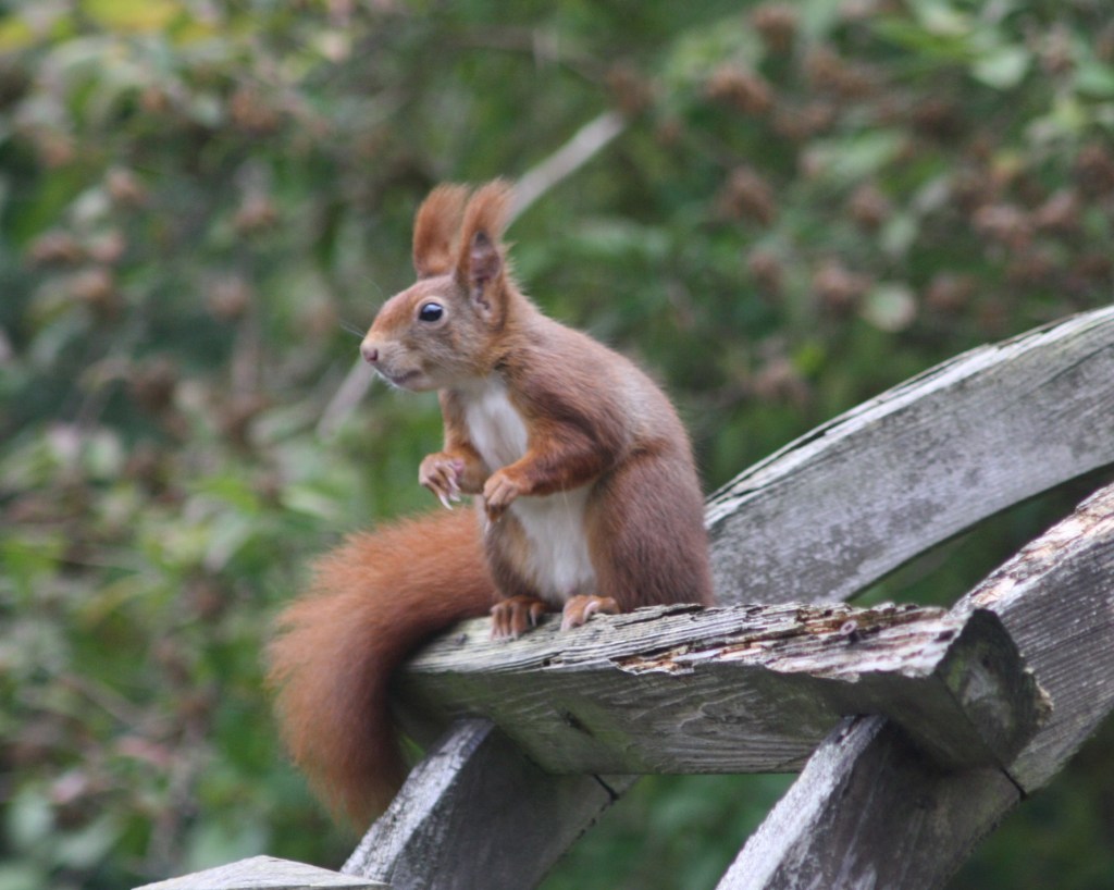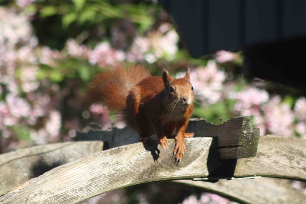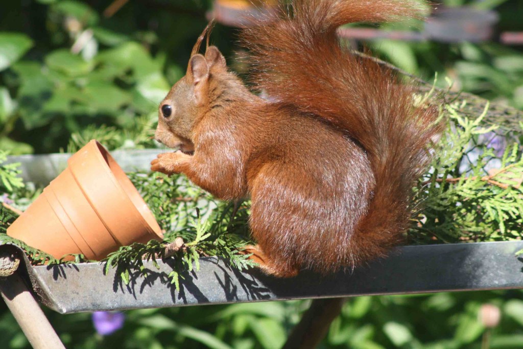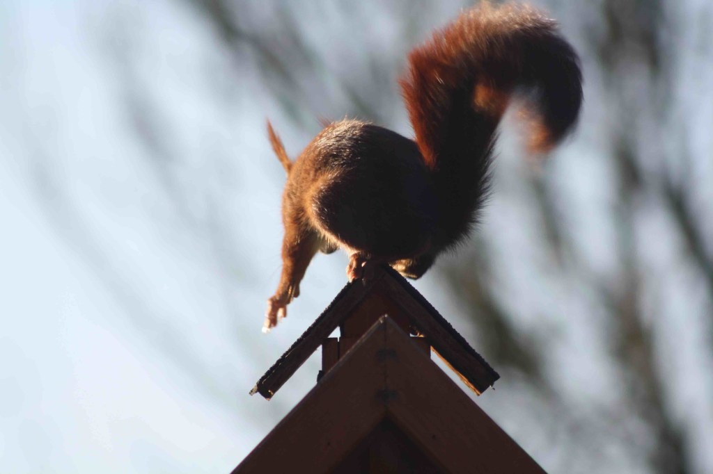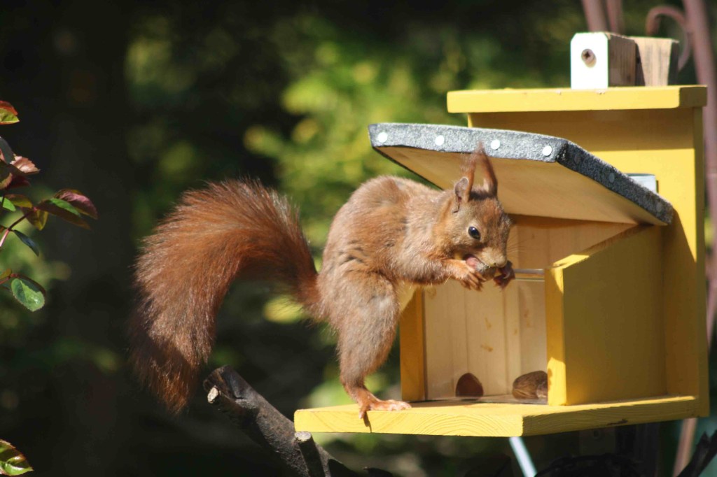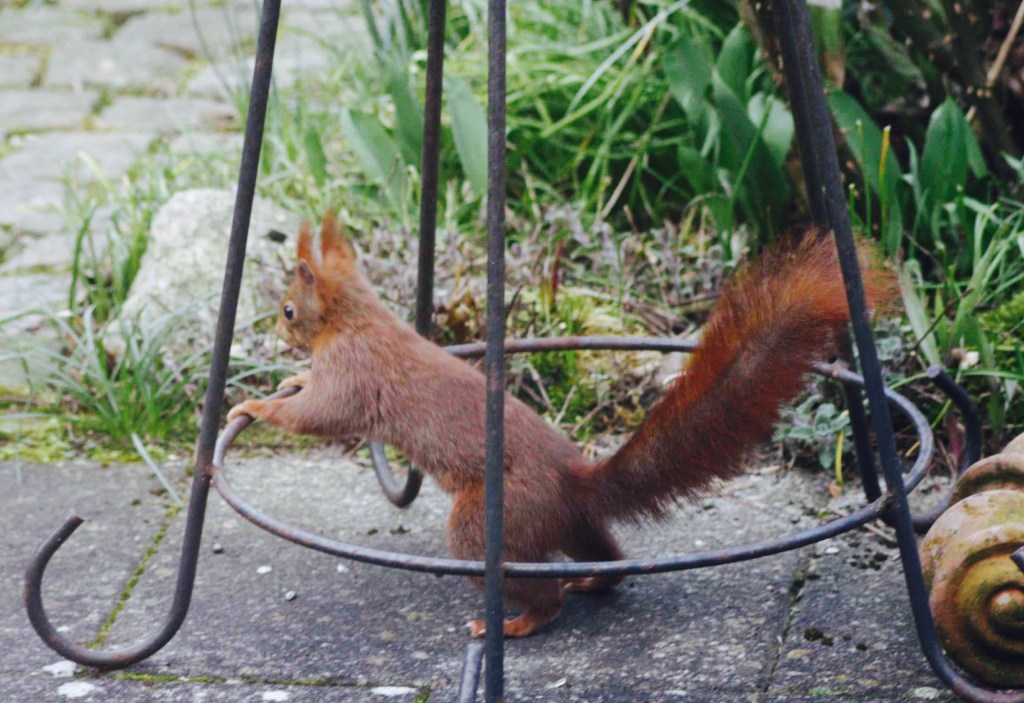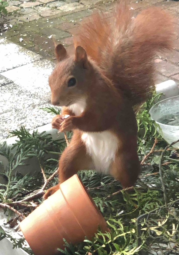 Wer meinem Blog folgt, weiß, dass der „kleine Fresssack“ unsere Eichhörnchen im Garten heißen. Denn sie fressen den Singvögeln regelmäßig die Sonnenblumenkerne weg, obwohl für die Hörnchen extra Nüsse bereitgestellt werden. Der Name ist also Programm.