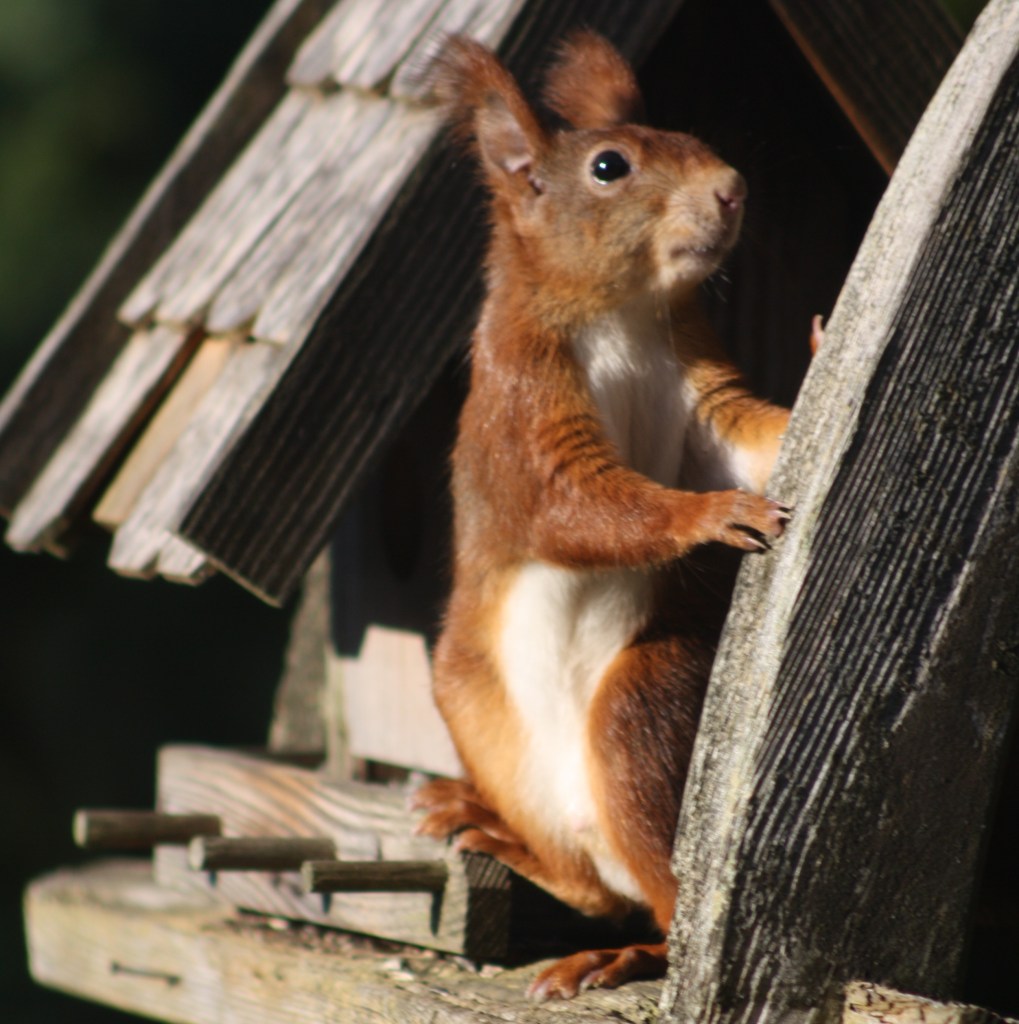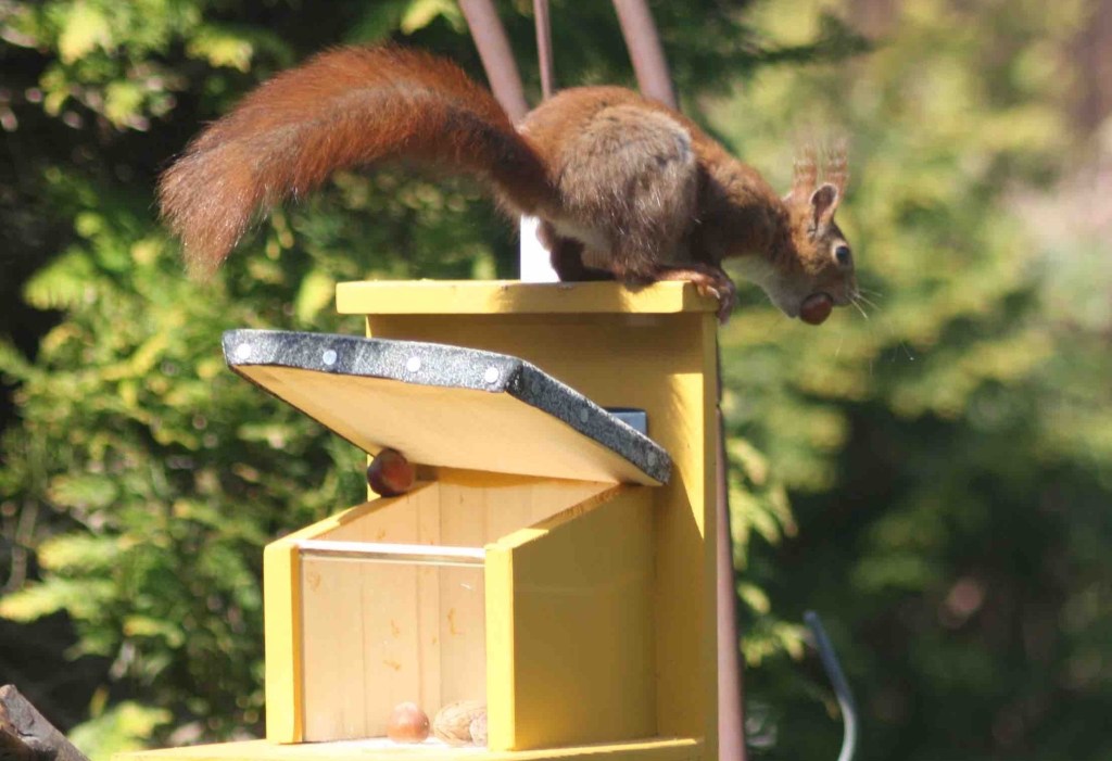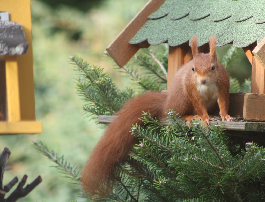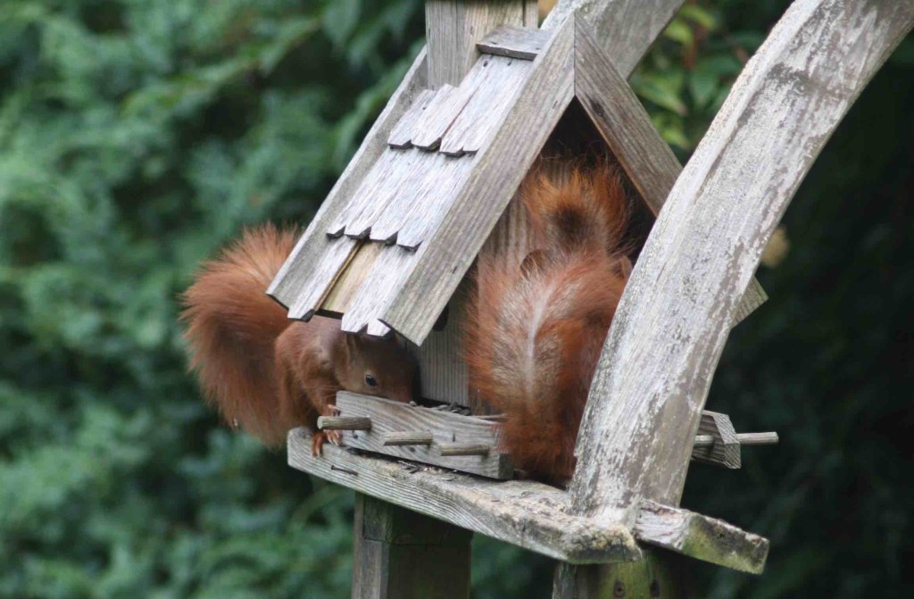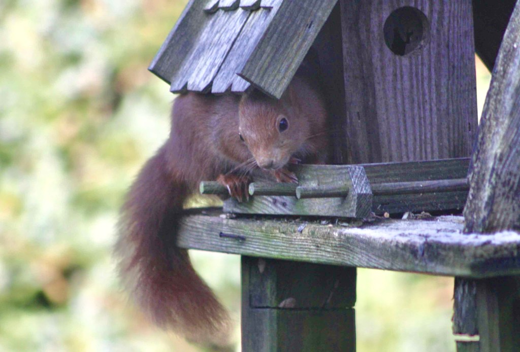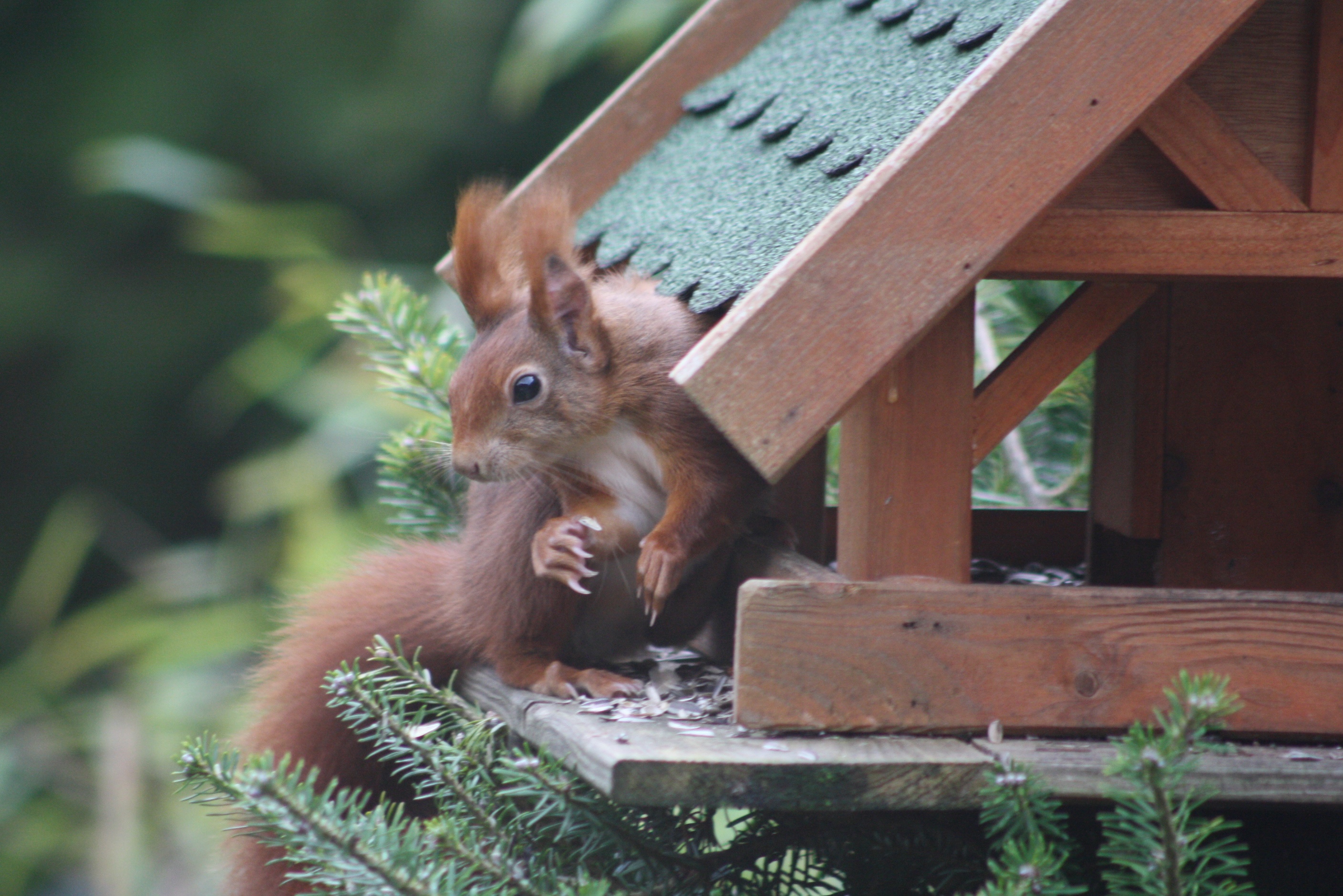 Und einer sucht Schutz unterm Dach des Vogelhäuschens, obwohl es nicht mal regnet.