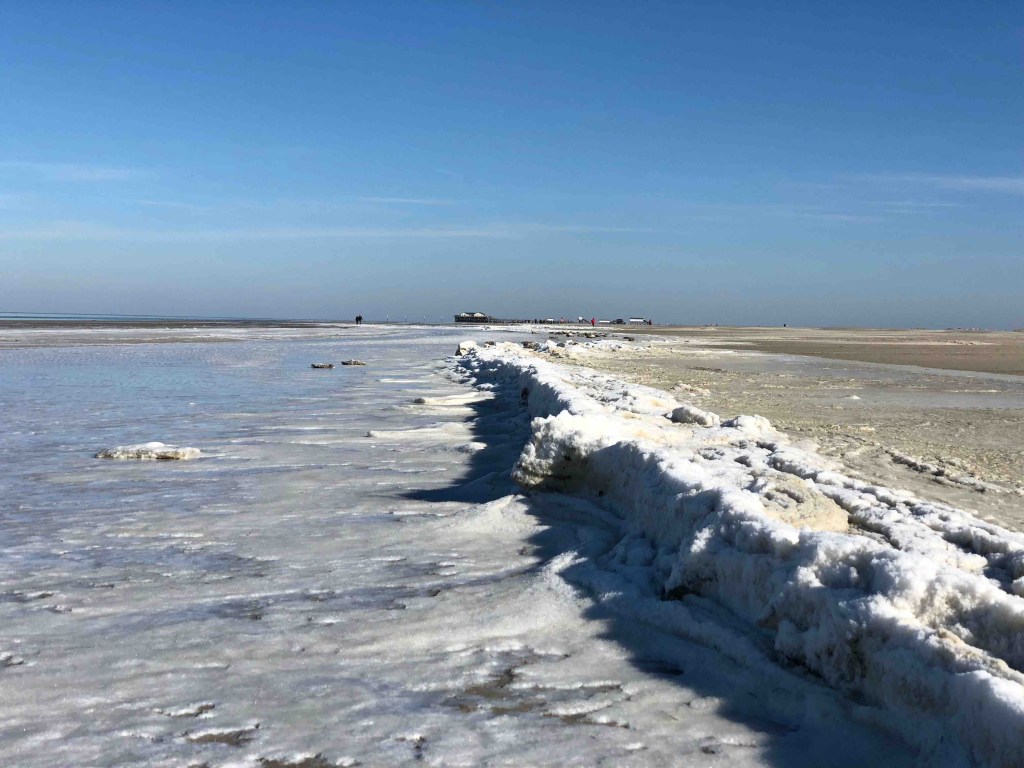 Vor einigen Jahren hatte ich bei einem Besuch das Glück, dass dicke Eisschollen am Strand lagen und die Wellen an der Wasserkante zu einem hellen Teppich gefroren waren. Das sah für meinen Geschmack schon spektakulär aus. Aber vielleicht bin ich auch nur leicht zu beeindrucken… jedenfalls war alles an der Wasserkante gefroren, die Sonne schien, der Himmel war richtig kitschig hellblau und kaum Menschen am Strand. Perfekt! Die Investition in warme Winterklamotten hat sich rentiert. Das ist für mich Urlaub!