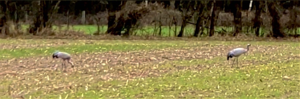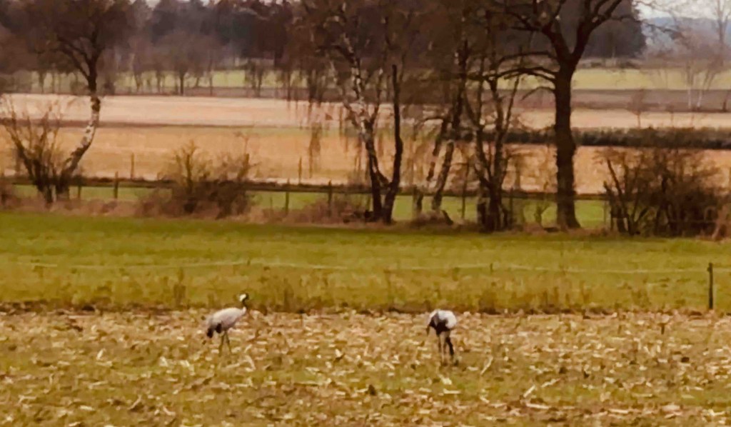 Zwei Kraniche suchen auf einem Stoppelfeld in Buchholz nach Futter. Ich fahre rechts ran, um mir die Zwei anzusehen. Meine Kamera habe ich nicht dabei, nur mein iPhone. Ich zoome die zwei ran, aber aus Erfahrung weiß ich, dass ich es nicht wirklich scharf kriege auf die Entfernung.