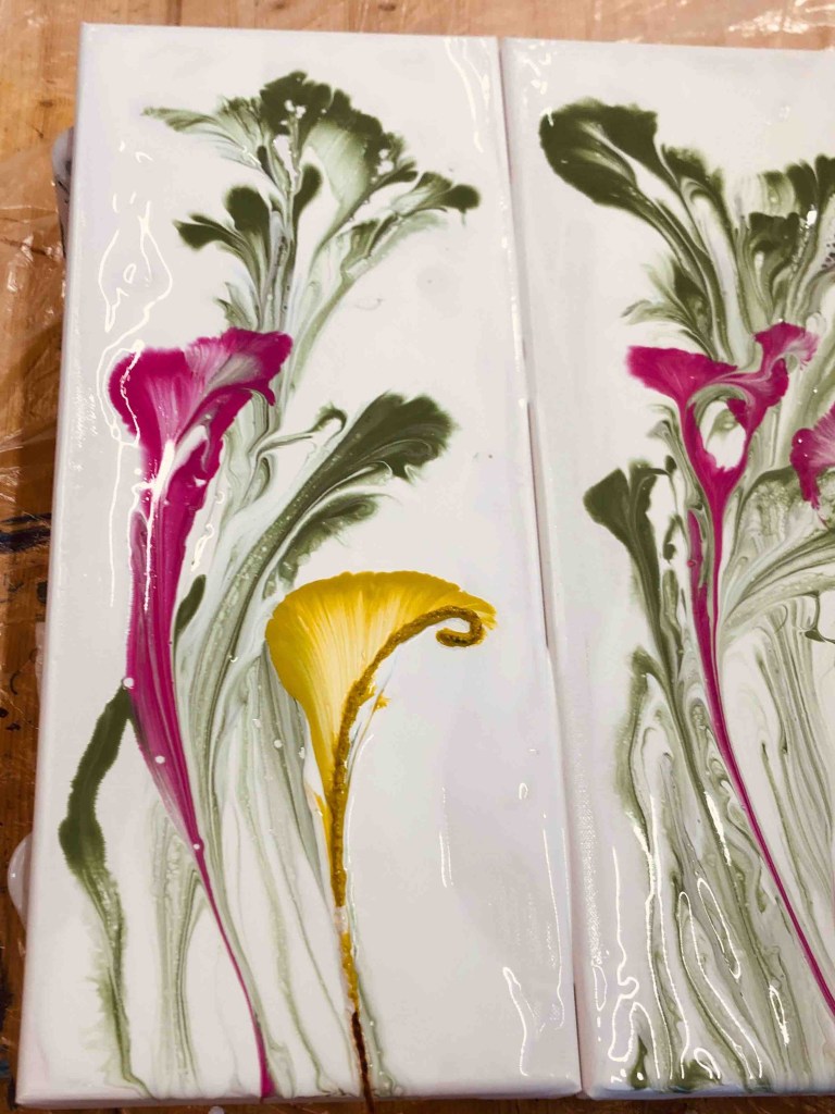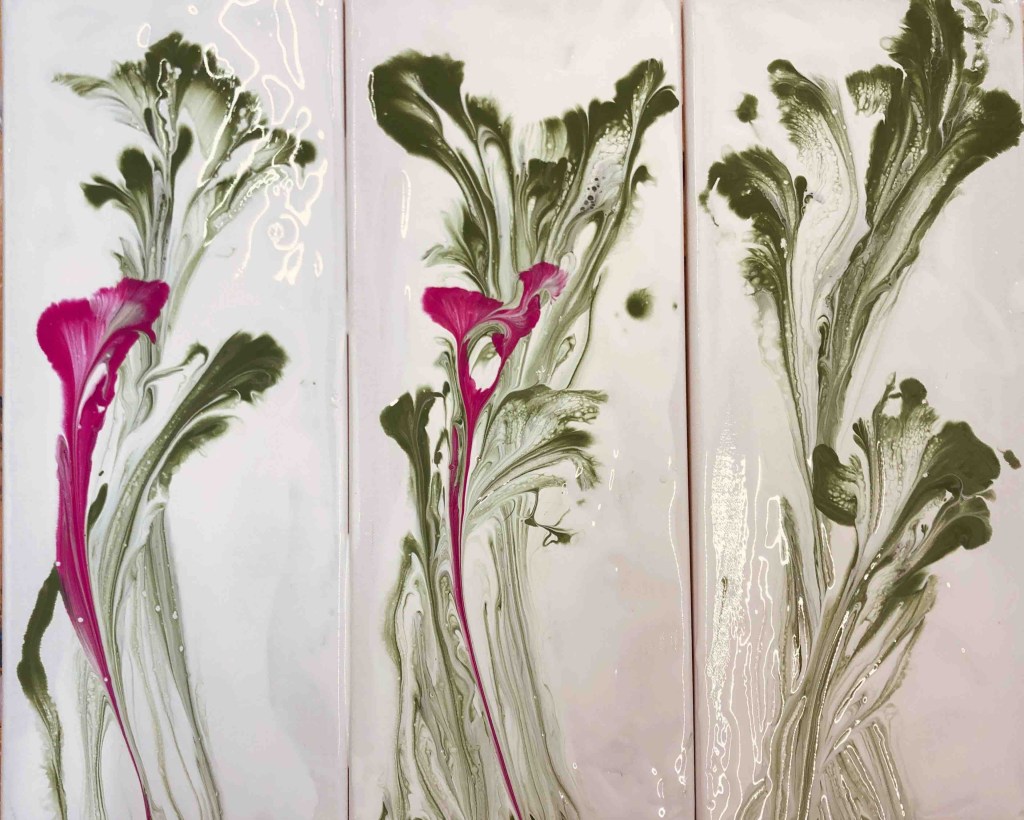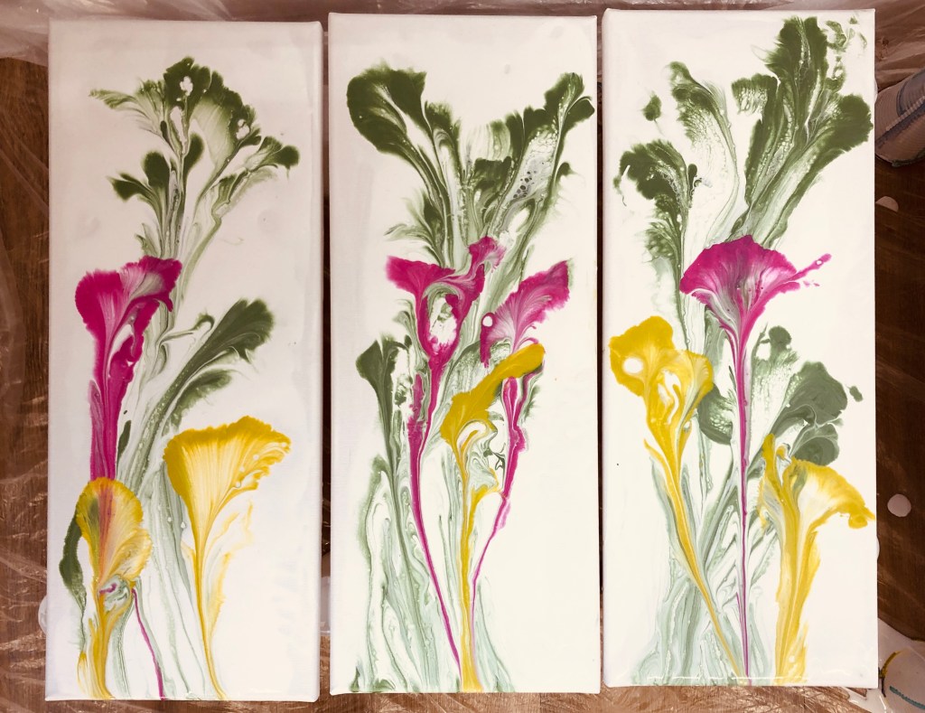 Ich habe mich für 3 gleichgroße Keilrahmen entschieden, die ich mit weißer Acylfarbe grundiert habe. Dann habe ich blumigen Farben (Grün, Ocker und Pink) angerührt und mit etwas Silikonöl versetzt.