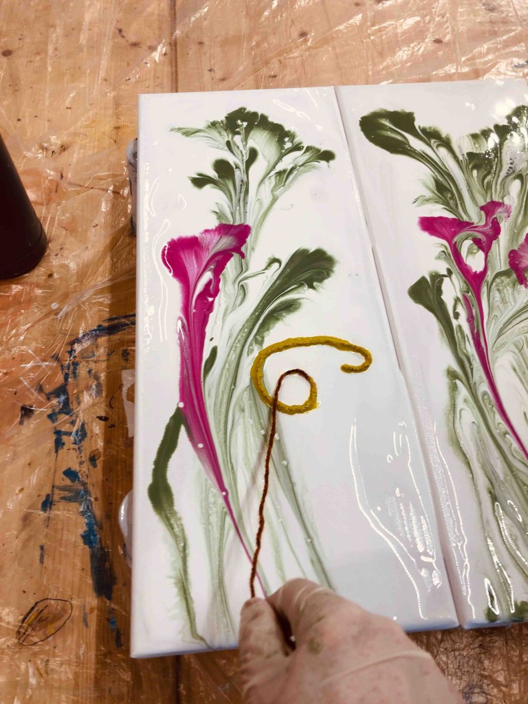 Daher freue ich mich immer, wenn ich bei Kursen und Workshops wie dem „Pouring Workshop“ in der Galerie SINNFALL in Buchholz neue Techniken lerne. Ich hatte keine Ahnung, dass man mit Bindfäden blumenähnliche Gebilde auf die Keilrahmen bekommt. Das macht richtig Spaß und sieht mal ganz anders aus.