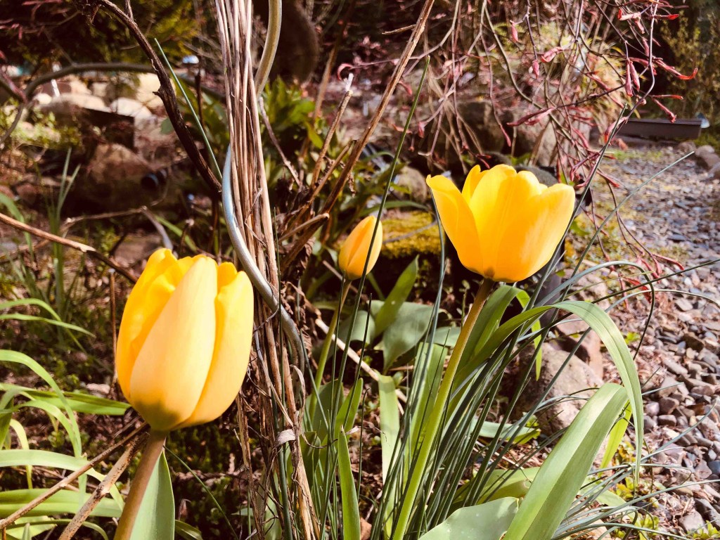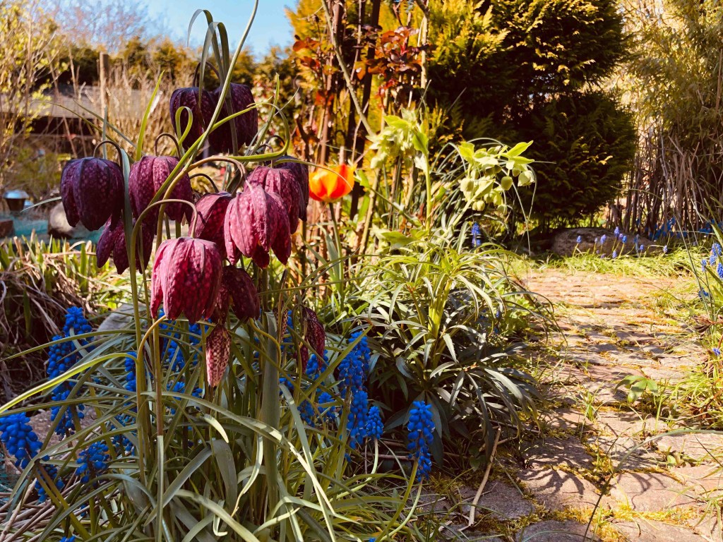Und dann sind da noch die bunten Tulpen und kleinen blauen Traubenhyazinthen vermehren sich auch von Jahr zu Jahr. Ich liebe bunt! Auf der Leinwand und im Garten kann es gar nicht bunt genug sein. Wenn ich mich für nur ein oder zwei Farben entscheiden müsste, könnte ich das gar nicht.