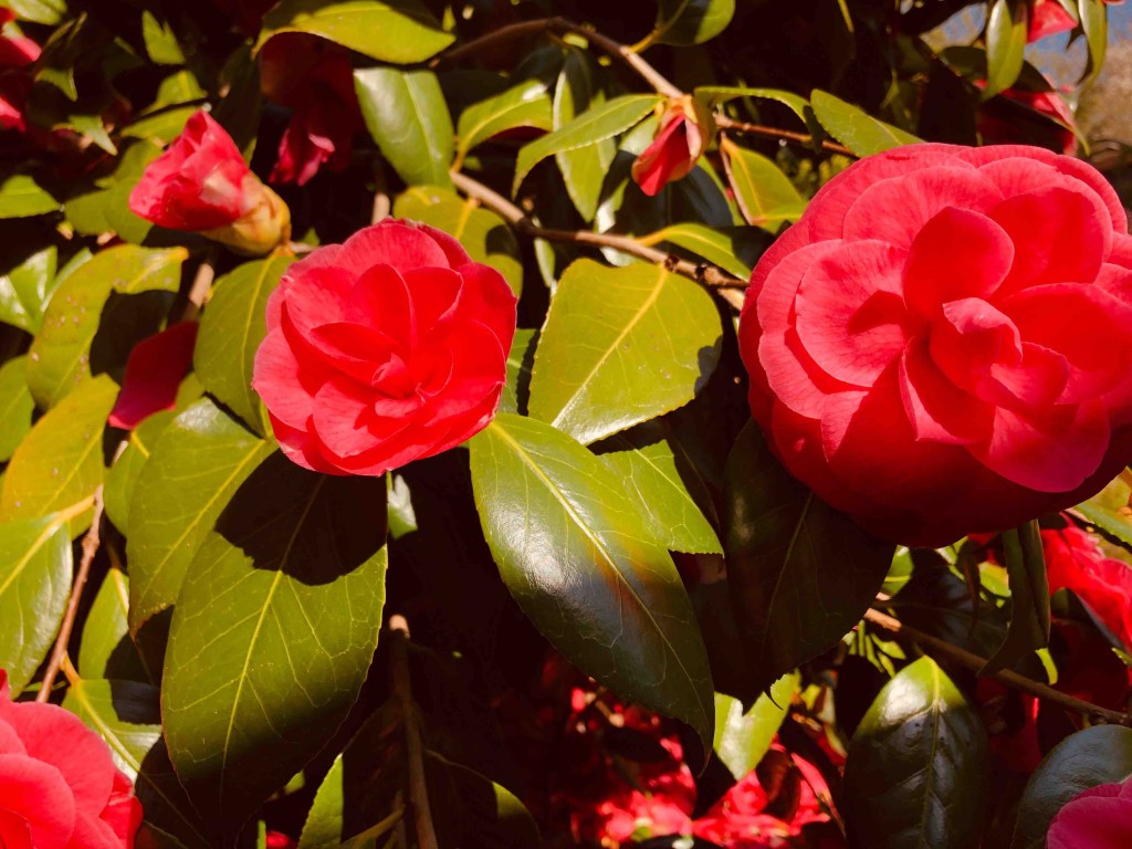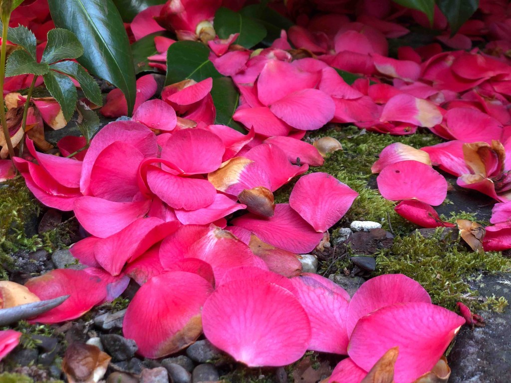 Und dann ist da noch meine Kamelie, die leider das Erblühen schon hinter sich hat. Sie hat noch ein paar schöne rosa Blüten. Der Rest ist oder wird jetzt braun. Traurig sieht es aus, wenn die Blätter auf dem Boden landen. Aber so ist es halt.