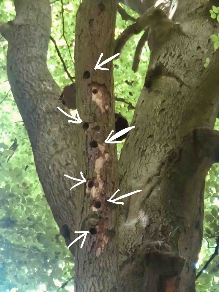 Wir konnten einen Buntspecht beobachten und haben merkwürdige, tellerartige Pilze an Bäumen gesehen. Außerdem hatte dieser Baum mit den komischen Pilzen auch sehr gleichmäßig gebohrte Löcher. Ich bin nicht sicher, ob die von einem der Buntspechte stammen können. Welcher Vogel macht so viele Probelöcher in einen Baumstamm um dann doch woanders einzuziehen?