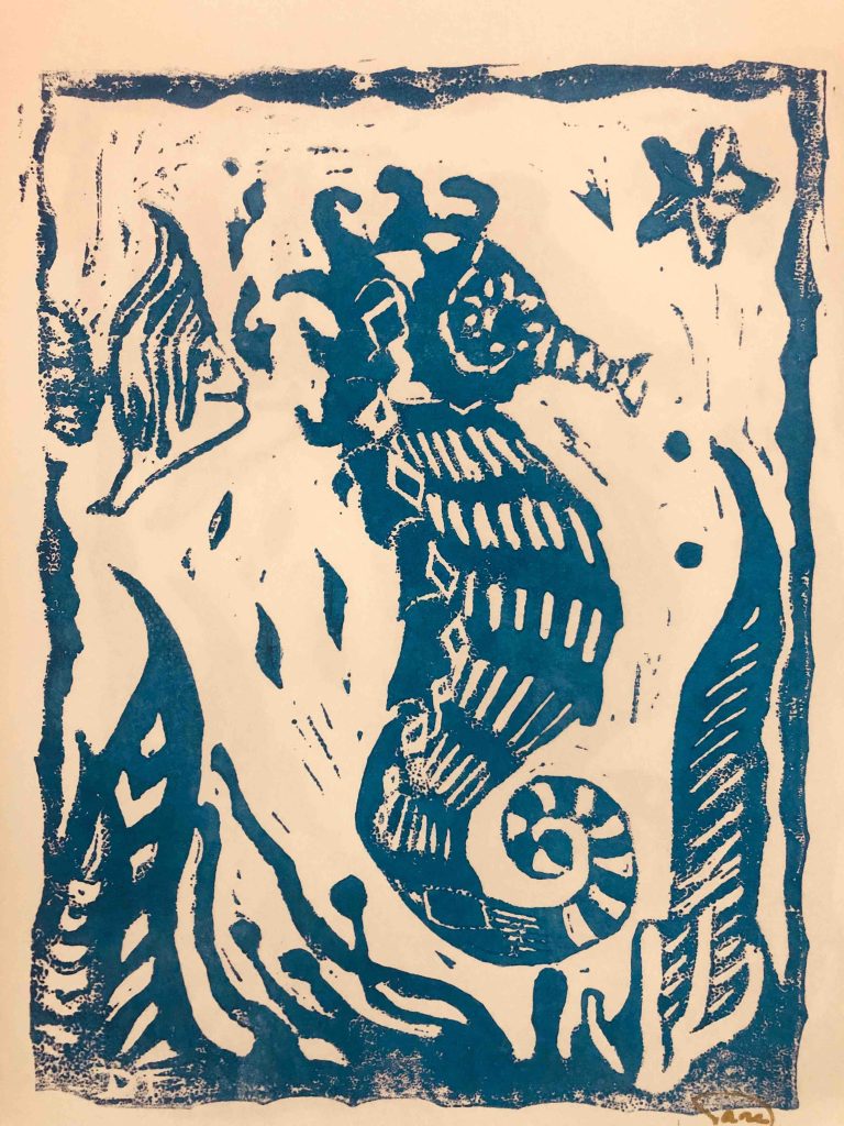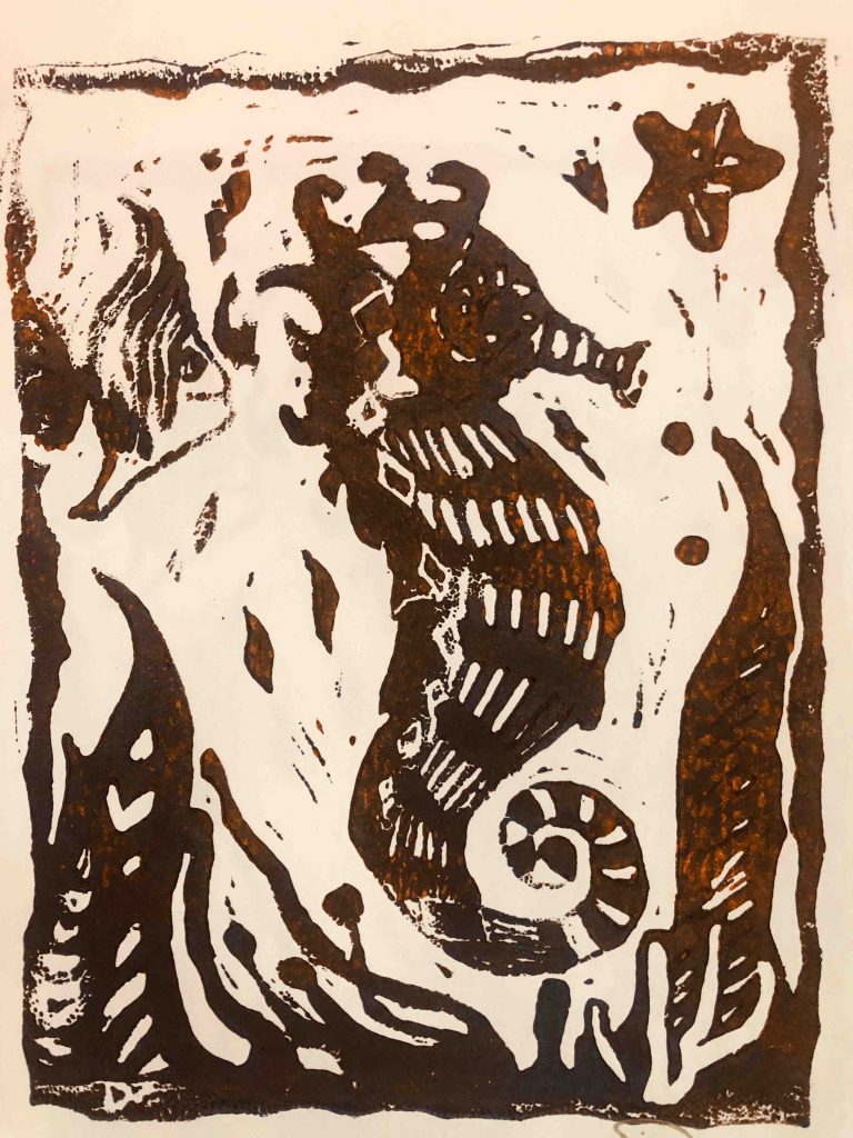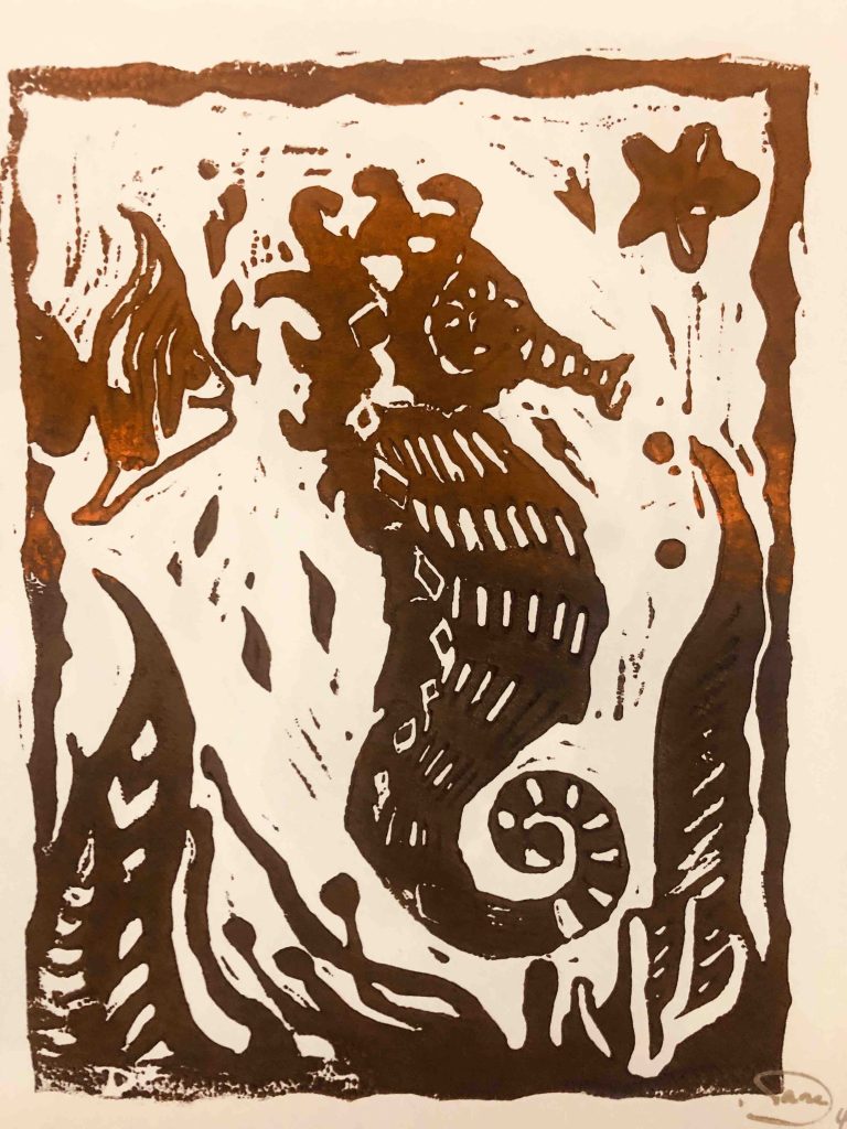Nun habe ich diese Technik praktisch für mich wieder ausgegraben und eine weitere Platte geschnitten. Diesmal mit Motiven aus dem Meer. Spaß macht es und ich kann beliebig viele Drucke davon manchen. Habe versucht mit Farbverläufen zu arbeiten. Hier mit mäßigem Erfolg.