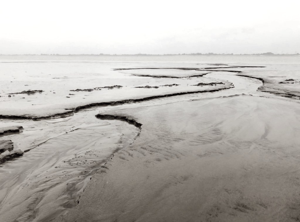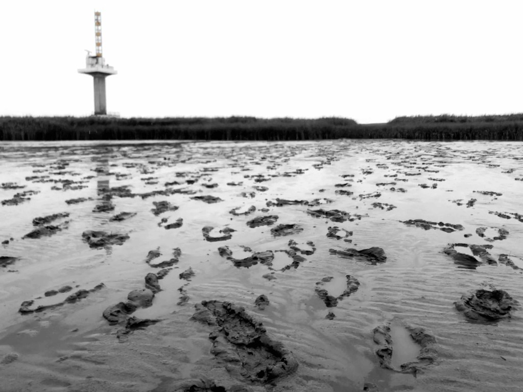 Über eine Holzbrücke betreten wir das Watt. Glitschig ist schon das Holz der Brücke, dann versinke ich mit meinen Gummistiefeln knöcheltief im Schlick. Ausrutschen möchte ich nicht! Langsam gewöhne ich mich an das Driften meiner Stiefelsohlen ohne das Gleichgewicht zu verlieren. Ich hoffe auf Tiere im Watt. Aber sehen kann nur die seichten Wellen auf dem Boden. Keine Wattwurmhaufen, wie ich es von der Nordsee her kenne. Auch keine kleinen Krebse – schade. Nur ein paar Reste von einigen Krebsbeinen, die die Vögel übrig gelassen haben.