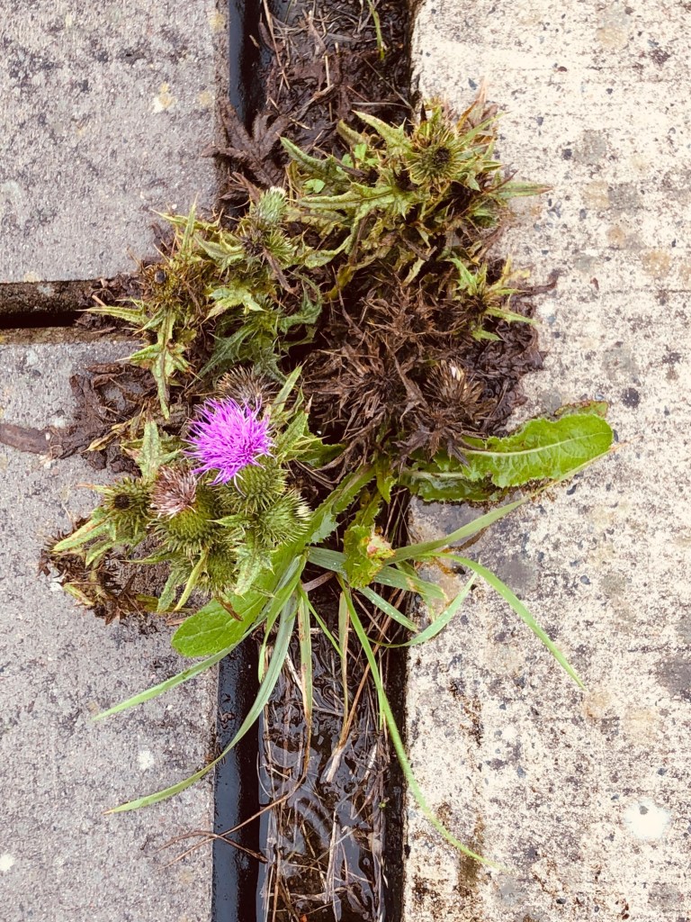 Nach all den diesigen Eindrücken und grauen Fotos stoße ich doch noch auf etwas Farbe. Diese kleine Kratzdiestel wächst zwischen den Steinen am Deich und bringt für heute die meiste Farbe in diesen Tag.