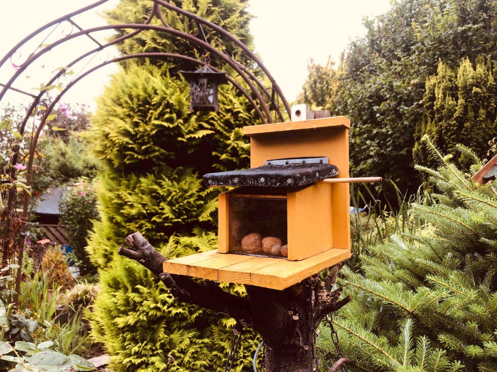 Das Eichhörnchen-Futterhaus ist mit mehreren Wal- und Haselnüssen gefüllt. Es hat einen relativ kompakten Deckel, der vor Regen schützt. Da sich in den letzten Wochen keines der kleinen Gartenbesucher daraus bedient hat, begann ich mal wieder an ihrer „Fingerfertigkeit“ zu zweifeln. Also habe ich, wie schon öfters, einen kleinen Stock zwischen Dach und Haus geklemmt. Das hat sich in der Vergangenheit gut bewährt, weil dann für die kleinen Fresssäcke offensichtlich ist, dass dort etwas zu holen ist.