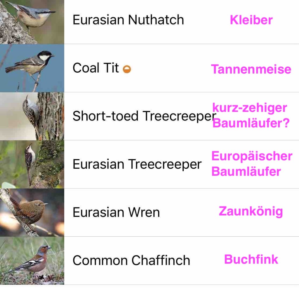 Da sich meine ornithologischen Kenntnisse sehr in Grenzen halten, benutze ich zur Bestimmung des Vogelgezwitschers eine App. Sie heißt „Merlin Bird ID“ und zeigt mit, welche Vogelstimmen ich gerade höre. Sie ist kostenlos zeigt die Vögel in englischer Sprache, daher übersetze ich es mir hinterher.