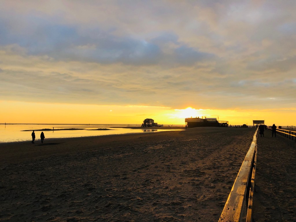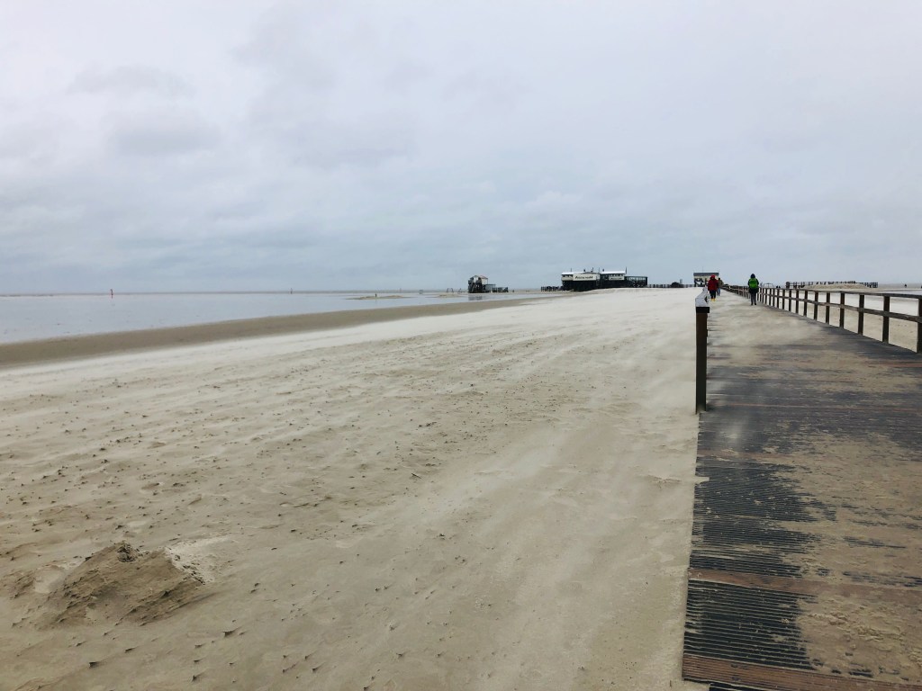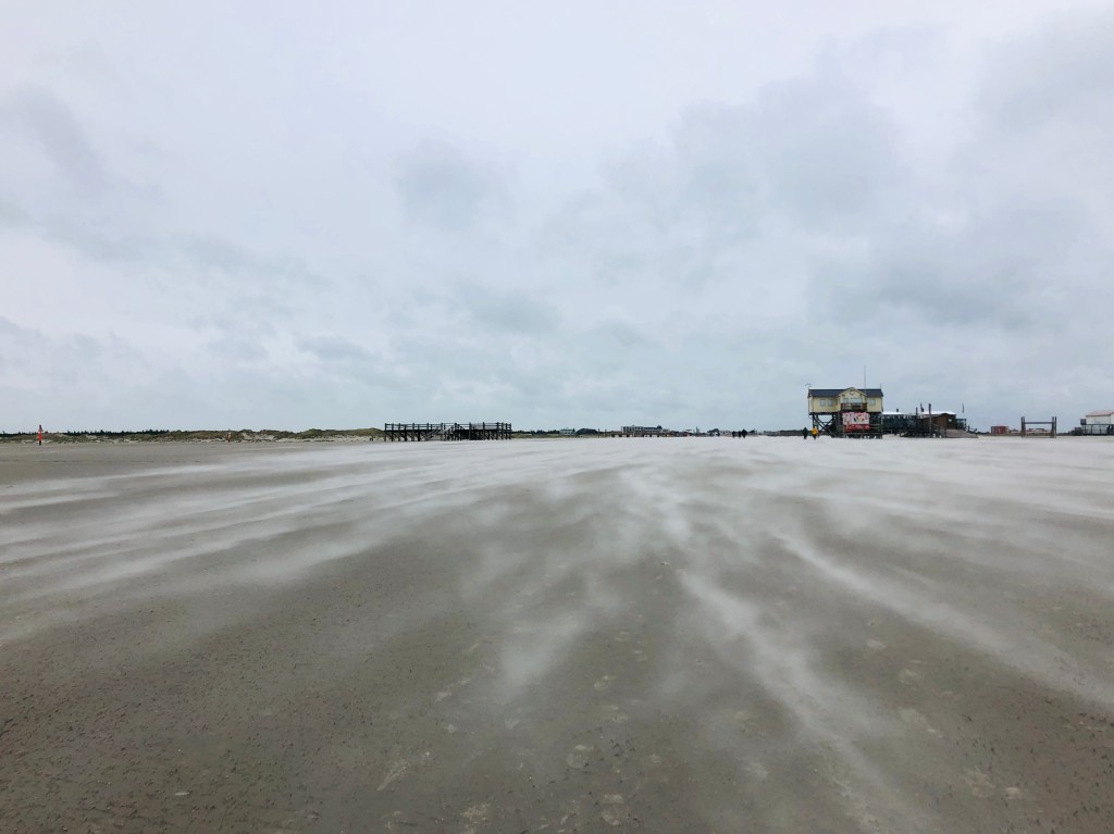 Wir ziehen unsere dicken Winterjacken an, Mützen auf und los an den Strand. Auf der Seebrücke in St. Peter Bad pfeift es richtig. Wenige Menschen sind unterwegs, einige drehen auf halbem Weg um. Vielleicht auch, weil sie nicht ganz passend angezogen sind … ein Jogger kommt uns in kurzen Hosen und T-Shirt entgegen. Ich schaue mit offenem Mund hinterher. Irgendwas hat der nicht mitgekriegt.