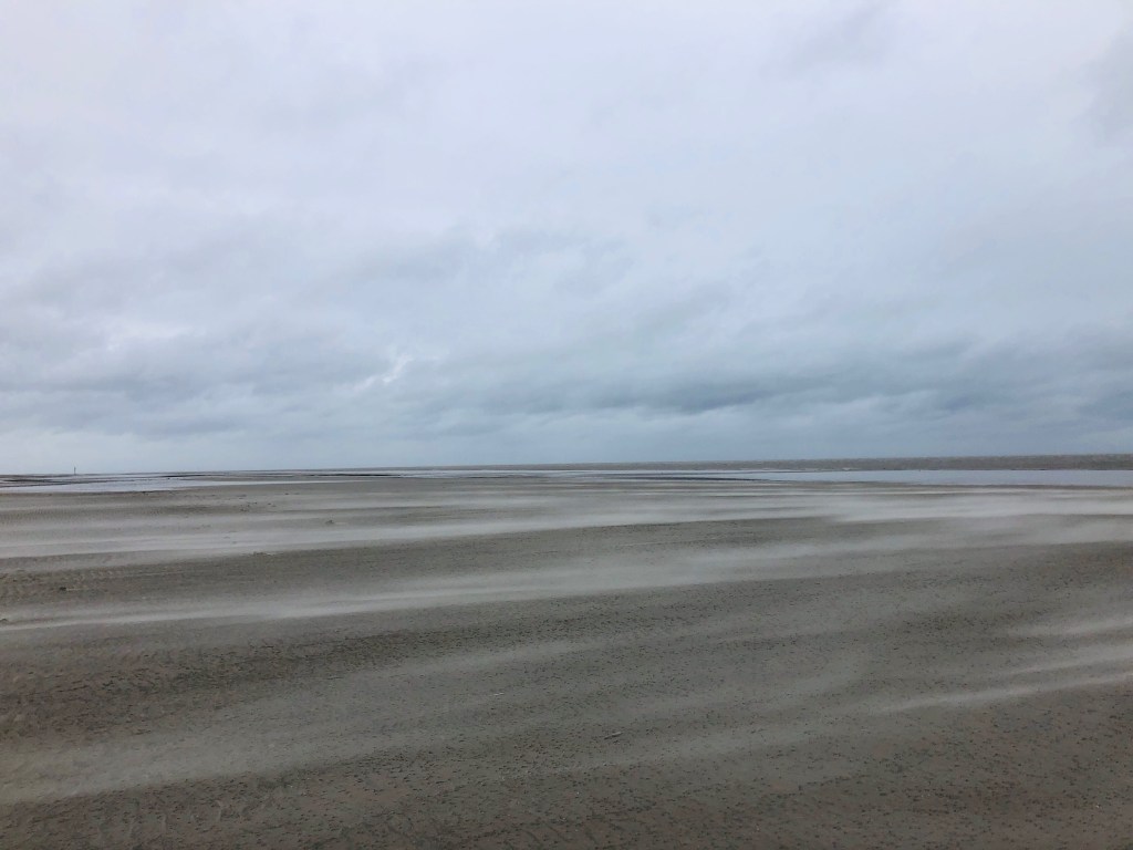 Es wird eine schwere Sturmflut an der Ostsee vom Wetterdienst vorausgesagt wird. Ich fahre an die Nordsee, wo das Wasser durch Ostwind weggeblasen wird. Also ist der Strand noch größer, als sonst. Da kann ich mit leben.