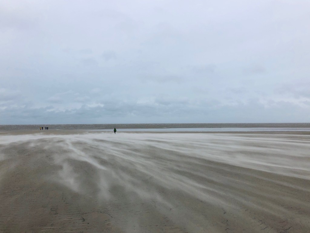 Der Wind bläst so stark, dass der Sand nur so über den Strand flitzt. Das sieht wirklich toll aus. Wie Nebelschwaden über dem Boden. Nur dass er sich ganz schnell fortbewegt. Nebel ist ja eher langsam unterwegs. Ich bin fasziniert davon, mache Fotos. Was ich erst später merke, dass der Sand nicht nur in Bodennähe so flott herum weht, sondern auch weiter oben. Denn der Rücken meiner Jacke ist schon mit einer ziemlichen Sandschicht bedeckt. Gut, dass er gerade von hinten kommt. Nicht auszudenken, wenn es uns so ins Gesicht blasen würde. Mist, wir müssen ja auch noch zurück.