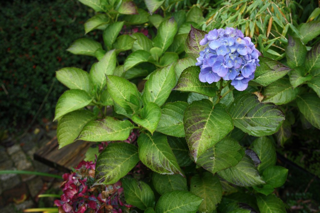 Die meisten Blüten sind schon abgeblüht, bis auf die blaue Hortensie. Die hat noch eine recht große frische Blüte. Auch ein gerngesehener Farbtupfer.