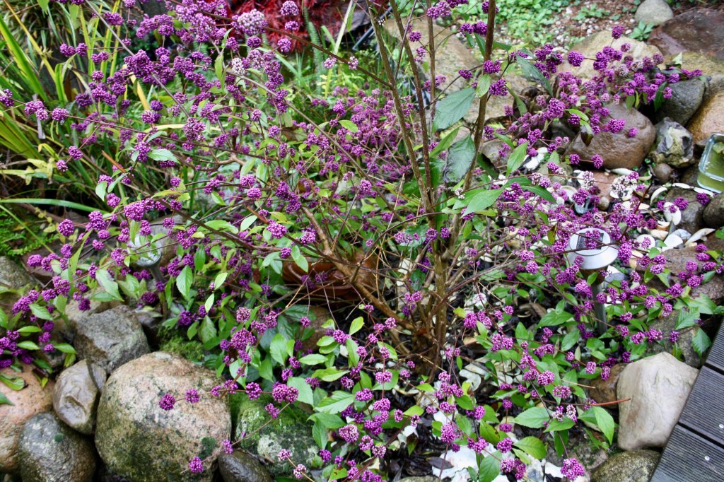 Zwischen unseren beiden kleinen Teichen steht ein Liebesperlenstrauch, der jetzt voller lilafarbener Liebesperlen steht.