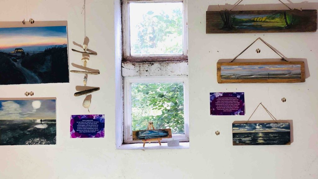Durch meine liebe Malfreundin Doris bekam ich die Möglichkeit, beim Kunstfest in Garlstorf meine schönsten Bilder und Hölzer auszustellen. Das war ein aufregendes Erlebnis für mich als Hobbykünstlerin, denn bisher hatte schon einige Male die Möglichkeit einzelne Bilder in Schaufenstern oder der Malschule zugehörigen Galerie Sinnfall in Buchholz auszustellen. Aber meine eigene Ausstellung auf mehreren Wänden zur Schau zu stellen, war schon besonders aufregend und hat wirklich Spaß gemacht.
