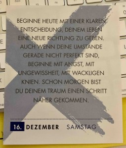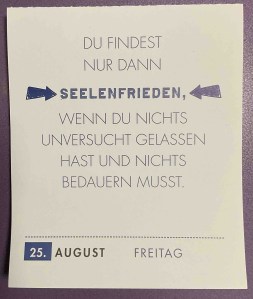 - Zu meinen guten Gewohnheiten zähle ich, mich morgens nach meinem Frühstück vom Kalenderblatt (siehe Beitragsbild) berieseln zu lassen. Lars Amend trifft mit seinem Motivationssprüchen ganz oft ins Schwarze. Der neue Kalender für 2024 steht schon bereit.