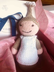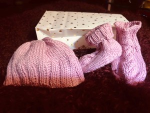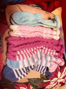 Und da ich liebendgerne stricke, habe ich ihr gleich eine kleine Ausstattung produziert: Socken, Babydecke, Püppchen, Mützen …