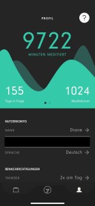 - Meditationen: 155 Tage infolge (habe ich tatsächlich mal einen Tag nicht meditiert. Dann fängt der Zähler gleich bei Null an)