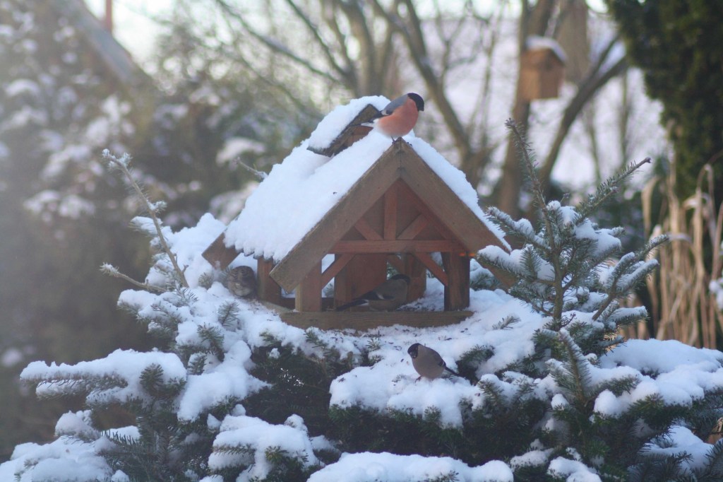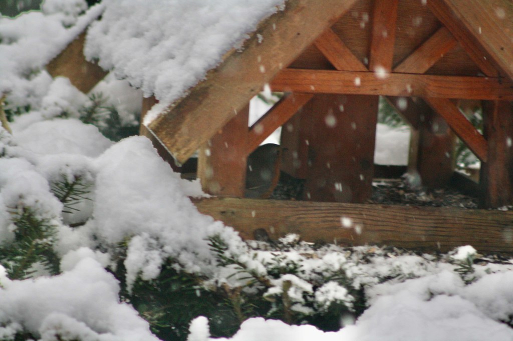 Im Garten schmilzt der Schnee langsam weg. Die Vogelhäuser sind wieder von allen Seiten erreichbar und werden von allen Gartenbewohnern genutzt. Den fliegenden und den huschenden Zwei und auch Vierbeinern: