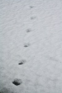 Glücklicherweise taut es langsam. Hier sind es bereits 3° plus. Unser Garten hat aber immer noch das Winterkleid an … Schnee auf der Terrasse. Der Teich ist noch von einer dicken Eisschicht überzogen. Die Fische werden durch einen Sauerstoffsprudler versorgt, aber sehen kann ich sie im Moment nicht. Die letzten Spuren im Schnee sind hoffentlich auch bald weggetaut.