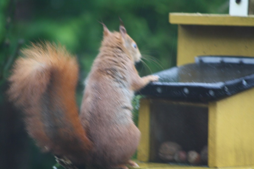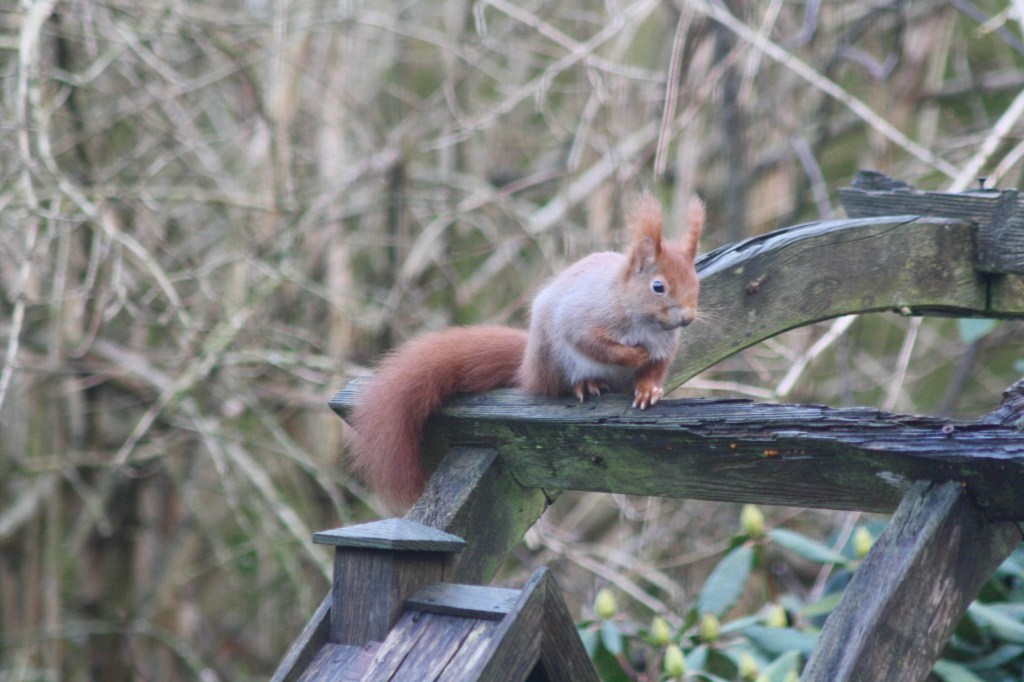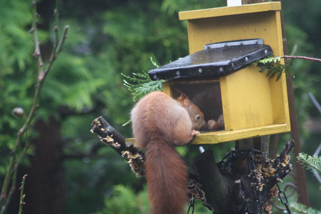 Im Garten gibt mir einer unserer Fresssäcke dieses Rätsel auf. Er hat recht graues Fell am Bauch und im Gesicht, der Schwanz und die Stirn sind aber schön rostrot. Meine Vermutung ist, dass es sich bei diesem Exemplar um ein älteres Eichhörnchen handelt.