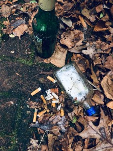 Natürlich dürfen Glasflaschen nicht fehlen. Sogar eine Pfandflasche, viele Glasscherben und diverse Kippen, die wie sollte es anders sein, aus den fahrenden Autos geworfen wurden. Denn einen Fußweg gibt es dort nicht. Der führt hinter der Lärmschutzwand einige Meter hinter dem Wall längs. Also bleibt nur diese abartige Entsorgung der rauchenden Autofahrer. Geht’s echt noch?