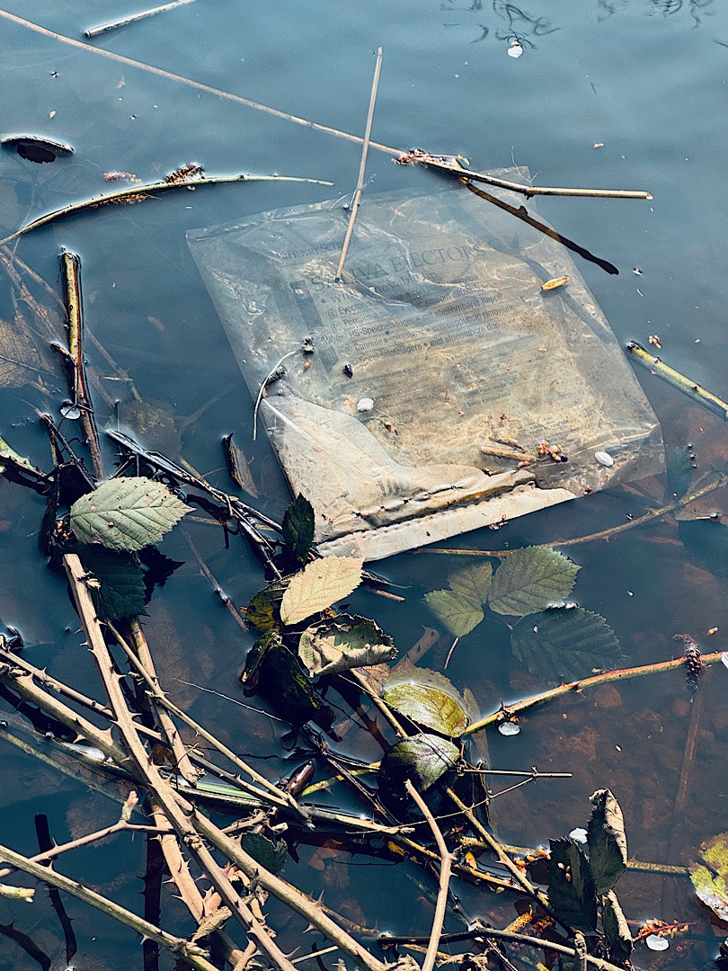 So schwamm diese Styroporschale für Essen im Burggraben. Um dort mit meiner Sammelzange hinzukommen, musste ich über eine ziemlich steile Böschung bis unten ans Ufer kommen. War nicht so einfach, wie es aussah. Aber unten angekommen konnte ich erkennen, dass Tiere schon davon probiert hatten. Die kleinen Bisse waren gut im Styropor zu erkennen. Das kann lebensbedrohlich für Tiere werden. Einige der Abbisse lagen neben der Schale, hat also nicht wirklich geschmeckt. Alles, was ich sehen konnte habe ich eingesammelt, sodass diese Gefahr gebannt ist.