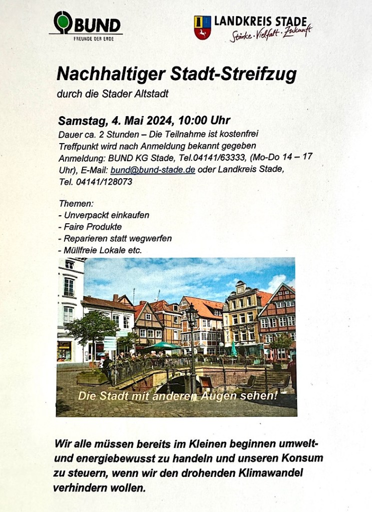 Hierzu lädt der BUND in Stade in Zusammenarbeit mit dem Landkreis Stade wieder zu kostenlosen Streifzügen durch die Stader Altstadt ein. Es werden Geschäfte besucht, die besonders nachhaltig sind.