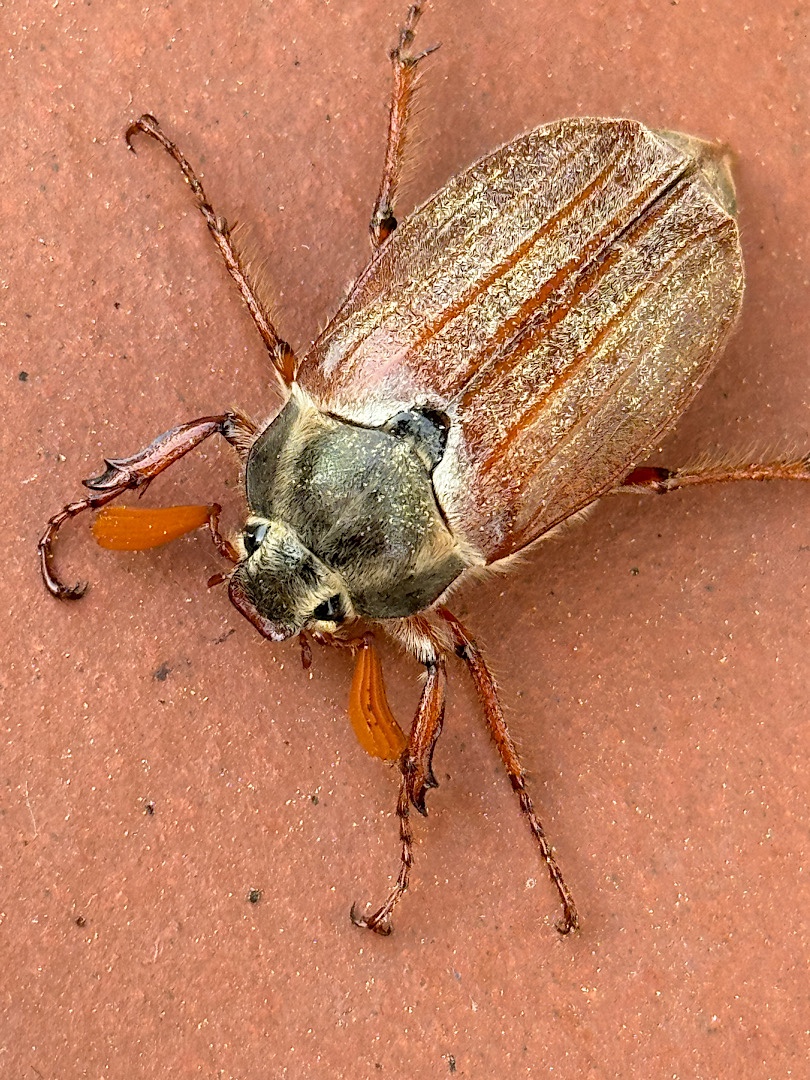 Heute Morgen trat ich aus der Haustür und stieß auf einen bewegungslos auf dem Rücken liegenden Maikäfer. Es sah erst so aus, als wäre er bereits tot. Aber dann bewegte sich eines der Beinchen. Mit einem Blatt drehte ich ihn auf den Bauch und hob ihn auf einen Busch im Vorgarten.
