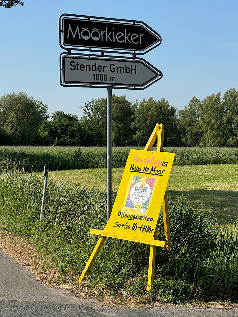 Die Location ist wirklich ziemlich abgelegen auf dem Gelände des Vereins zur Förderung von Naturerlebnissen. Vorsorglich weisen große gelbe Hinweisschilder auf unsere Ausstellung hin. Am Moorkieker-Bahnhof wartete der Moormeister auf Fahrgäste, die er dann zu uns ins „Haus im Moor“ brachte.