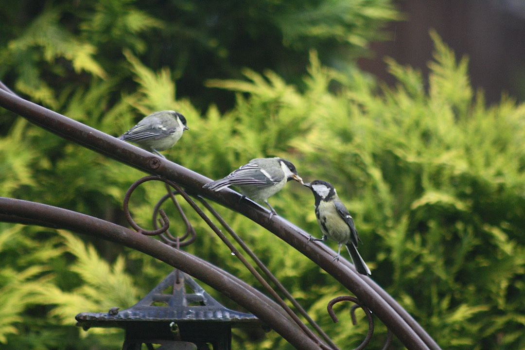 Es ist wieder soweit. Die kleinen Meisen sitzen auf unserem Rosenbogen und lassen sich von ihren Eltern füttern. Die Kleinen sitzen dort, aufgebläht und kugelrund. Das sieht so witzig aus, weil die Eltern so klein und schmächtig dagegen wirken. Die Meisenkinder sind so fluffig, wie kleine Wattebällchen und reißen ihre Schnäbel auf.