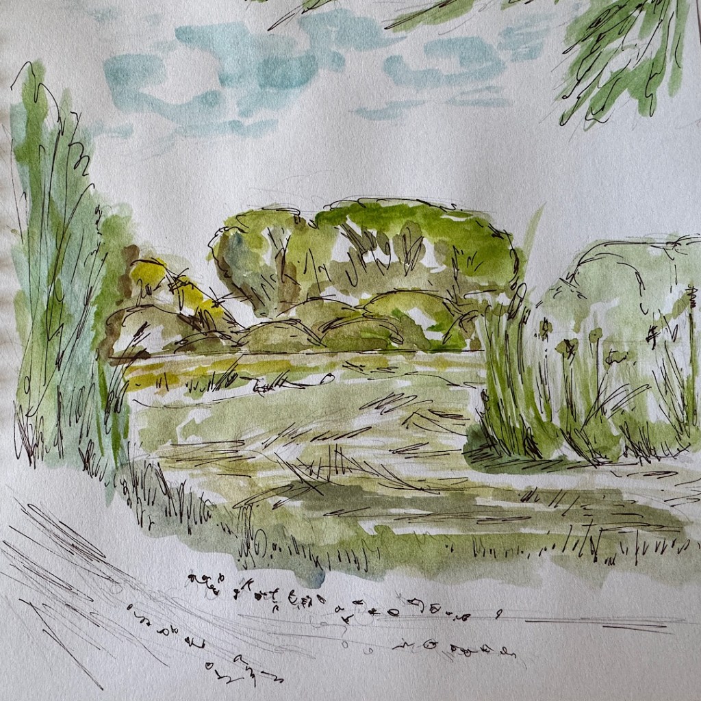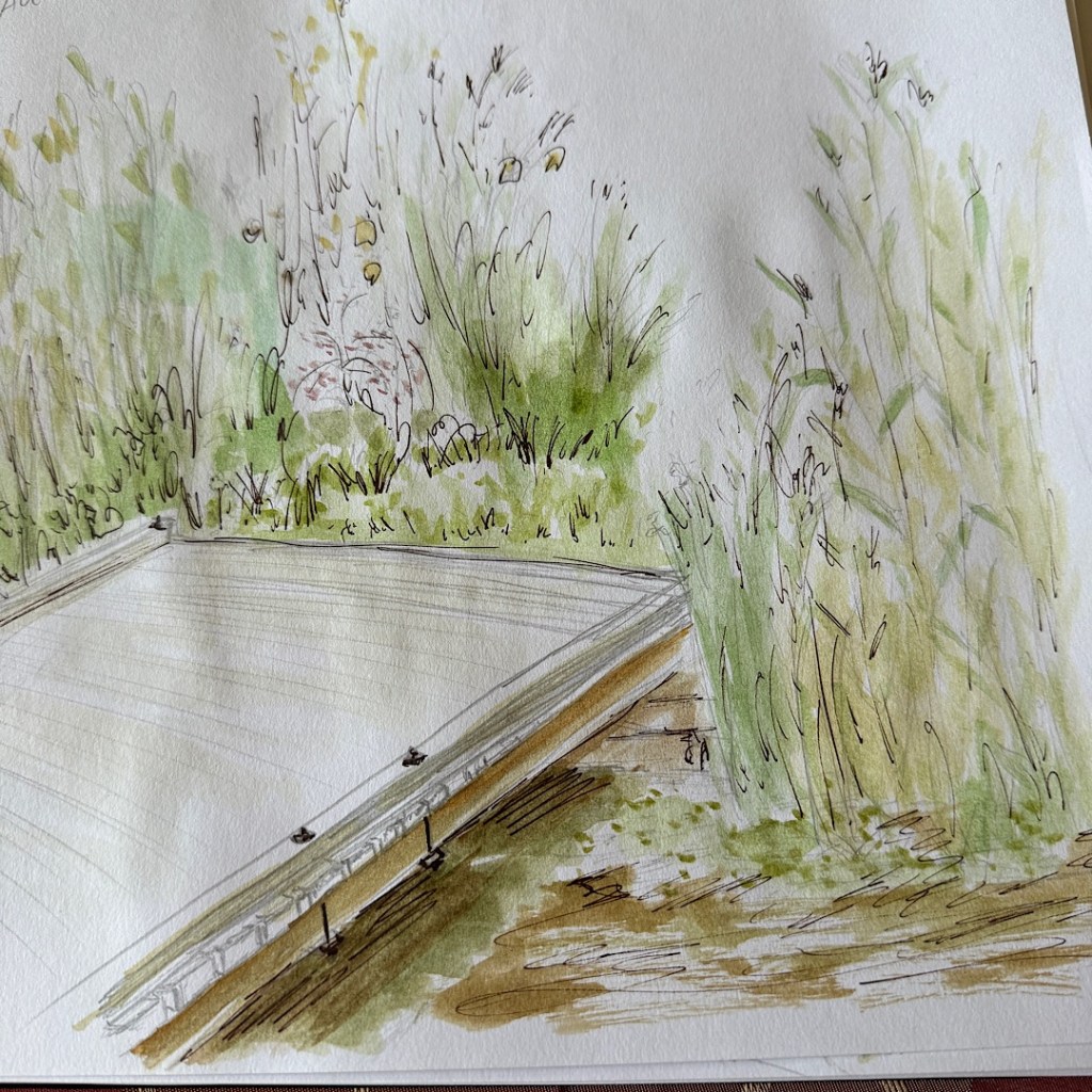 Also wähle ich die Brücke als Konstruktion aus mit etwas Wasser und den am Ufer stehenden Gräsern und Pflanzen. Erst zeichne ich mit Bleistift, dann aquarelliere ich und arbeite zuletzt mit dem Fineliner nach. Da mein Wassertankpinsel ziemlich dick ist, wird es oft nicht so optimal. Aber es ist so schön praktisch mit den Dingern.