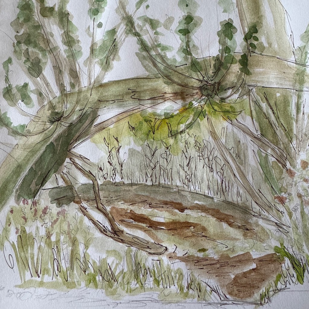 Ich bin allerdings ständig von Bremsen angeflogen und gebissen worden, sodass ich irgendwann den Platz gewechselt habe. Zwei kleine Wassertümpel zu den Seiten des Feldwegs und ein umgestürzter Baum ließen mich meine Malsachen wieder auspacken.