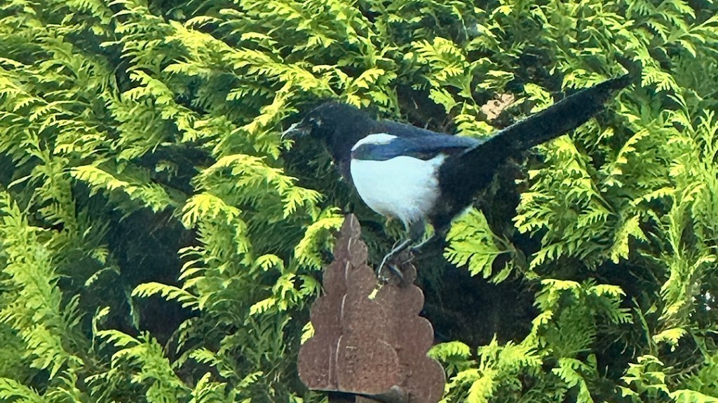 Manchmal lässt sich auch eine Elster oder eine Taube auf unserem Rosenbogen nieder. Die Tauben suchen nach Futter, wie die Spatzen. Die Elster schaut immer nur, lässt ihren klappernden Ruf hören und hebt dann wieder ab.