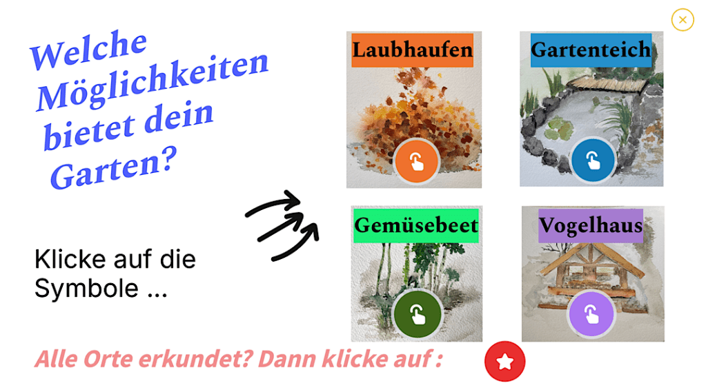 Das Besondere an diesem digitalen Lernmittel ist, dass ich die Bilder selbst gezeichnet und aquarelliert habe. Das hat mich zeitlich ziemlich zurückgeworfen. Aber das Ergebnis ist ungefähr so, wie ich es mir vorgestellt habe. Das Learning ist im browserbasierten Tool von Genially entstanden (kostenlose Version).