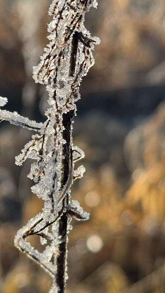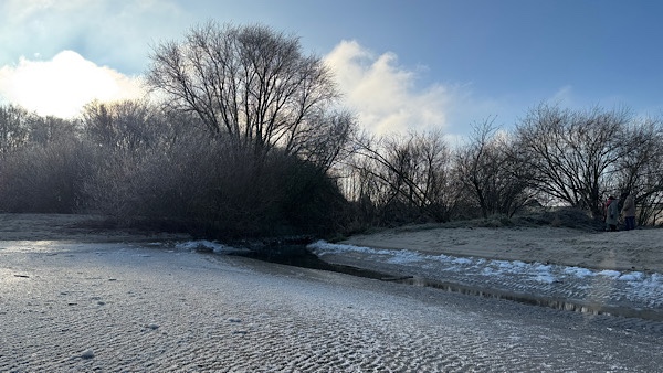 Der Weg zum Wasser führt an vom Frost eingehüllten Pflanzen vorbei. Sieht einfach toll aus, im Hintergrund die Sonne, der Deich. Der Weg führt durch ein Flussbett, was gerade leer ist.