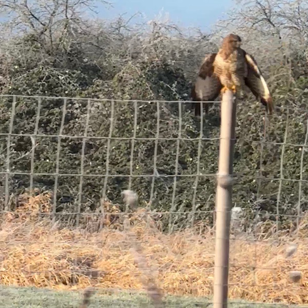 Möglicherweise ein Mäusebussard auf den Pfosten an der Straße.