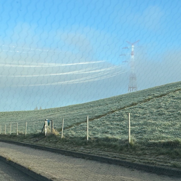 Gefrorene Oberleitungen glitzern im Sonnenschein. Ich fahre rechts ran und versuche es einzufangen. Leider sind die Leitungen der Frontheizung mit auf dem Foto 🤨