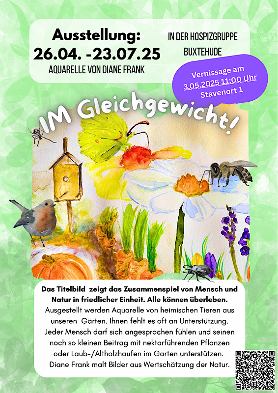 Die Vernissage findet am 3.5.2025 um 11 Uhr in den Räumen der Hospizgruppe Buxtehude, Stavenort 1 statt.