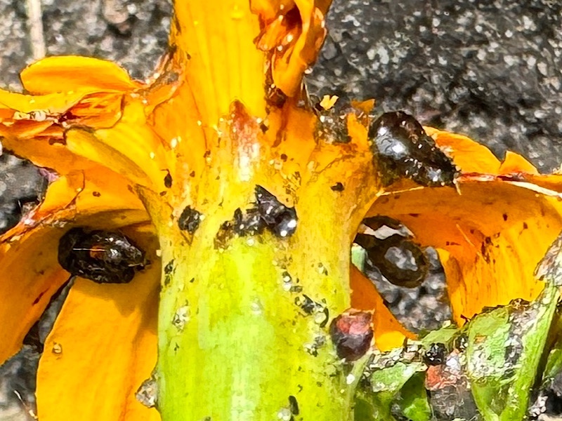 Was mich allerdings jetzt – nach 2 Tagen – sehr überrascht ist, dass die Tagetes fast komplett aufgefressen wurden. Die Beerenbüsche und Gemüsepflanzen stehen wie ˋne Eins. Nur von wem wurden die zur Abschreckung gepflanzten Tagetes gefressen? Zu sehen sind bis auf einige Ameisen und einige kleine schwarze unbestimmte Minikäfer nichts weit und breit. Aber die Blätter meiner Blumen sich fast alle futsch!