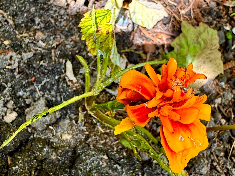 Ok, sie sind keine heimischen Pflanzen, aber Schnecken lieben Tagetes. Also könnte ich die Schuldigen gefunden haben. Nur habe ich keine Schneckenspuren im Beet gefunden. Sehr merkwürdig. Aber ich bleibe dran… Bei Vergrößerung dieser Fotos konnte ich dann doch noch Schneckenspuren finden. Schleimspuren entlarven die Täter, die sich inzwischen wieder verzogen haben.