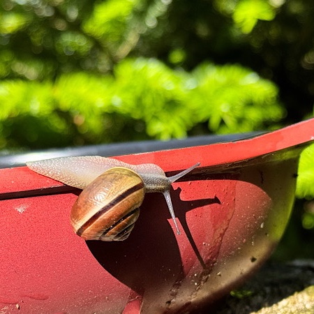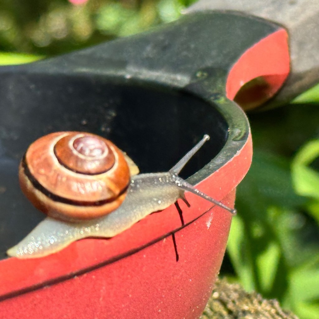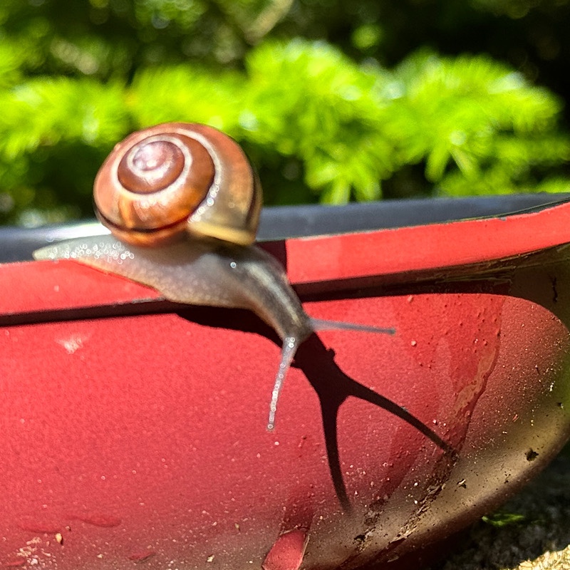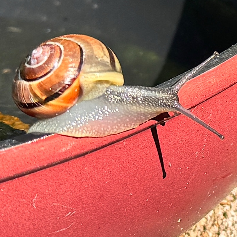 Aber es ist kein Vögel und auch kein Insekt. Es ist eine Bänderschnecke (Cepaea spec.) laut Obsidentify-App, die sich über den in der Mitte liegenden Stein zum Rand der Pfanne schiebt. Scheinbar hatte sie Durst und hat der Ort deshalb aufgesucht. Aber sie musste dafür durch ein Beet, über Terrassenplatten, einen Metallständer hoch, über eine Holzscheibe über den Rand der Bratpfanne kriechen, um ans Wasser zu kommen. Für mein Empfinden ein sehr hoher Aufwand. Leichter hätte sie einen der Teiche erreichen können.