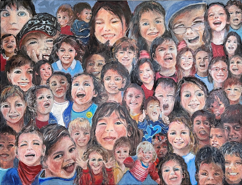 Dorothee hat dieses Bild zum Thema „Zukunftsvisionen“ gemalt. Hintergrund ist, dass sie sich wünscht, dass alle Kinder dieser Welt glücklich sind. Sehr schöne Idee finde ich.