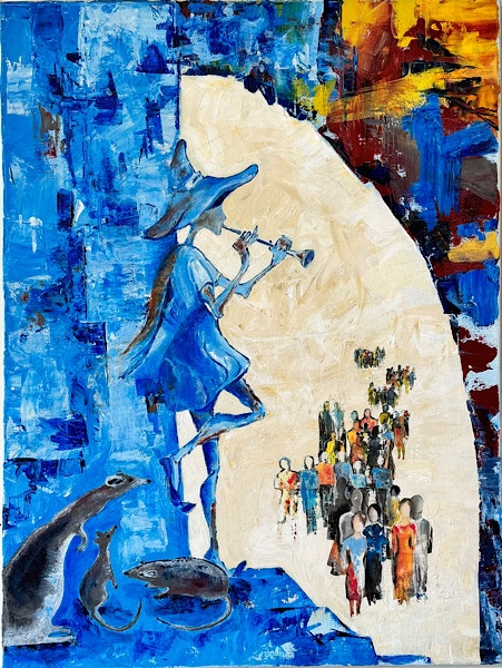 Den „Rattenfänger“ hat sie zum Thema „Märchenhaftes“ gemalt. Ursprünglich sogar in zwei unterschiedlichen Ausführungen. Ein rotes Exemplar hängt jetzt in einem Kinderzimmer, weil es so schön zum roten Teppich passt. Das blaue finde ich aber auch sehr sehenswert.